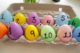 You'll need 12 plastic eggs, an empty egg carton (optional, but it helps keep the eggs, and the kids, organized), and sharpie to get started. Just number the eggs 1-12, and then number the slots in the carton as well.